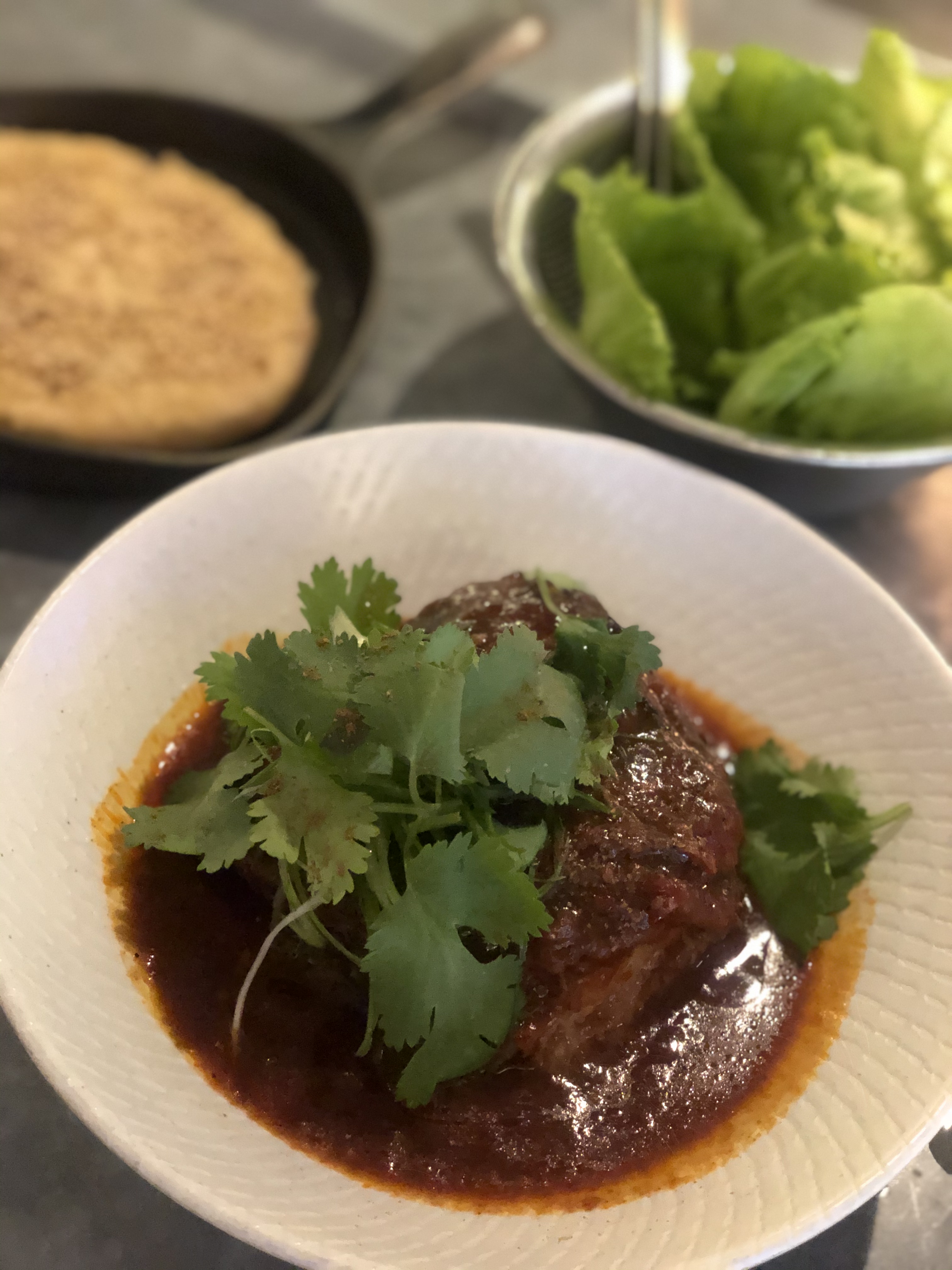 천천히 익힌 사천식 양고기, 참깨빵과 고수페이스